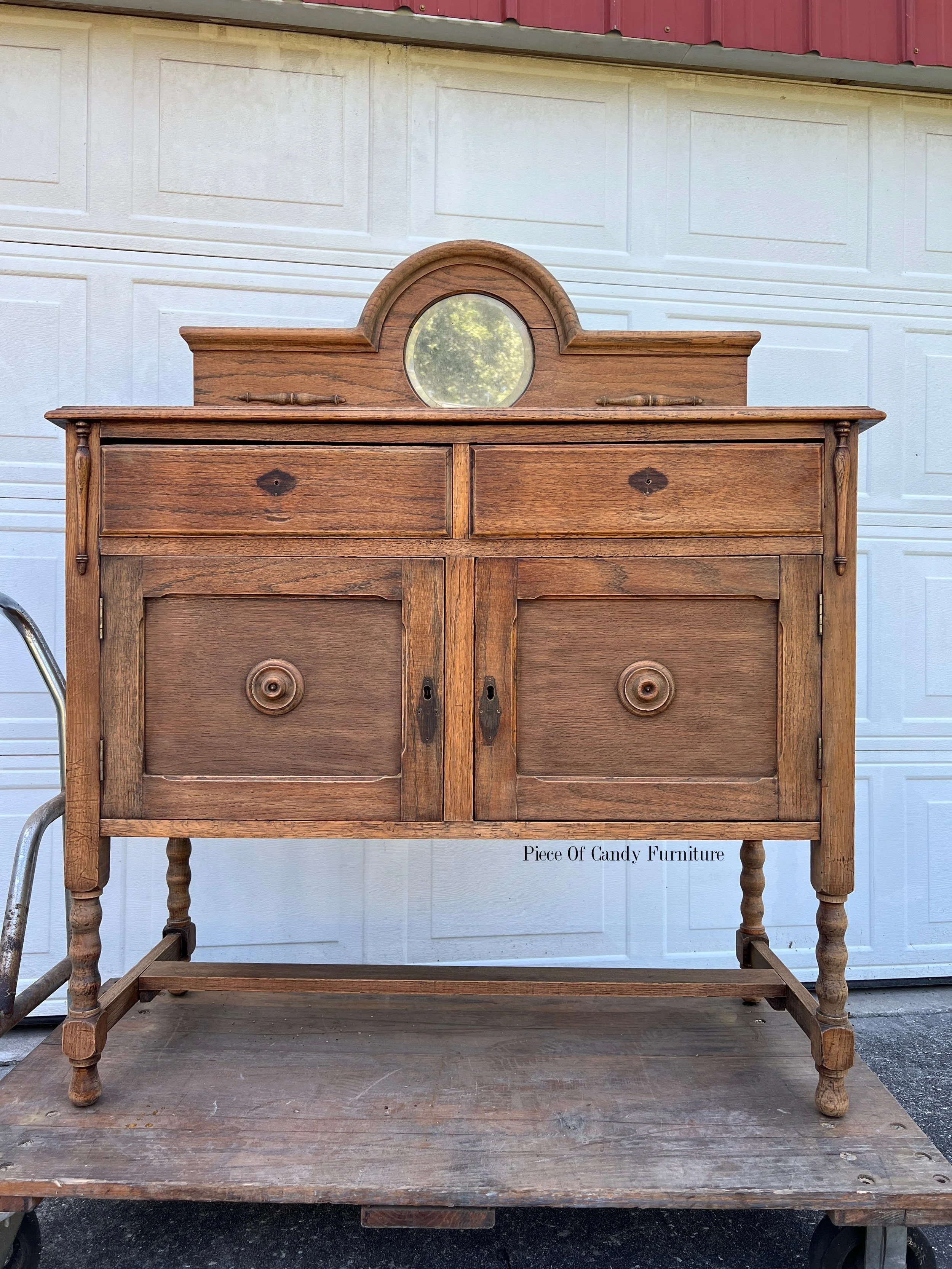 It didn’t need much repair. The repair we did do was the inner drawers. They had a gap in the back. We sanded it all down. Oak buffets are fairly simple to sand down as long as there isn’t a heavy sealer on top.