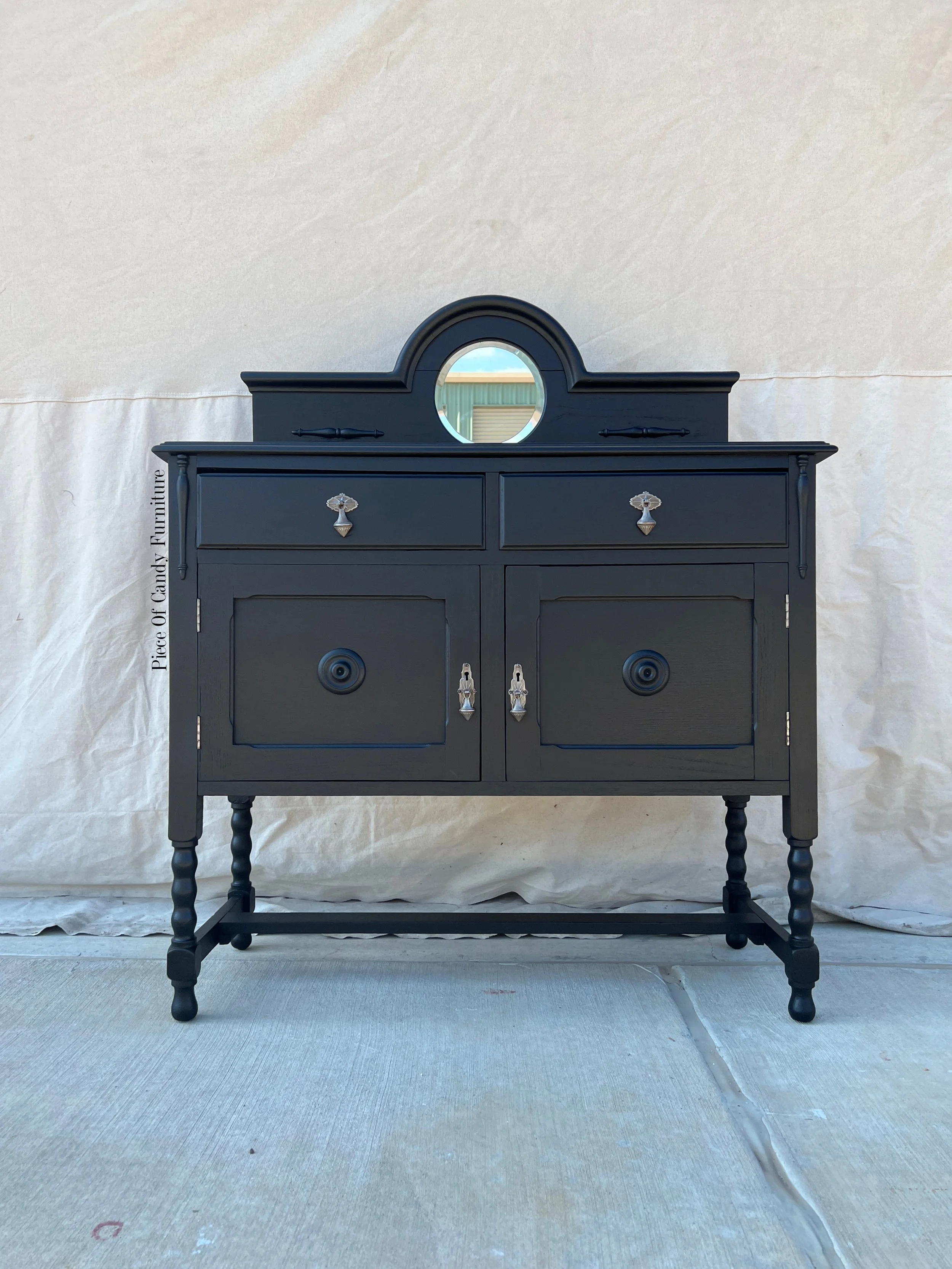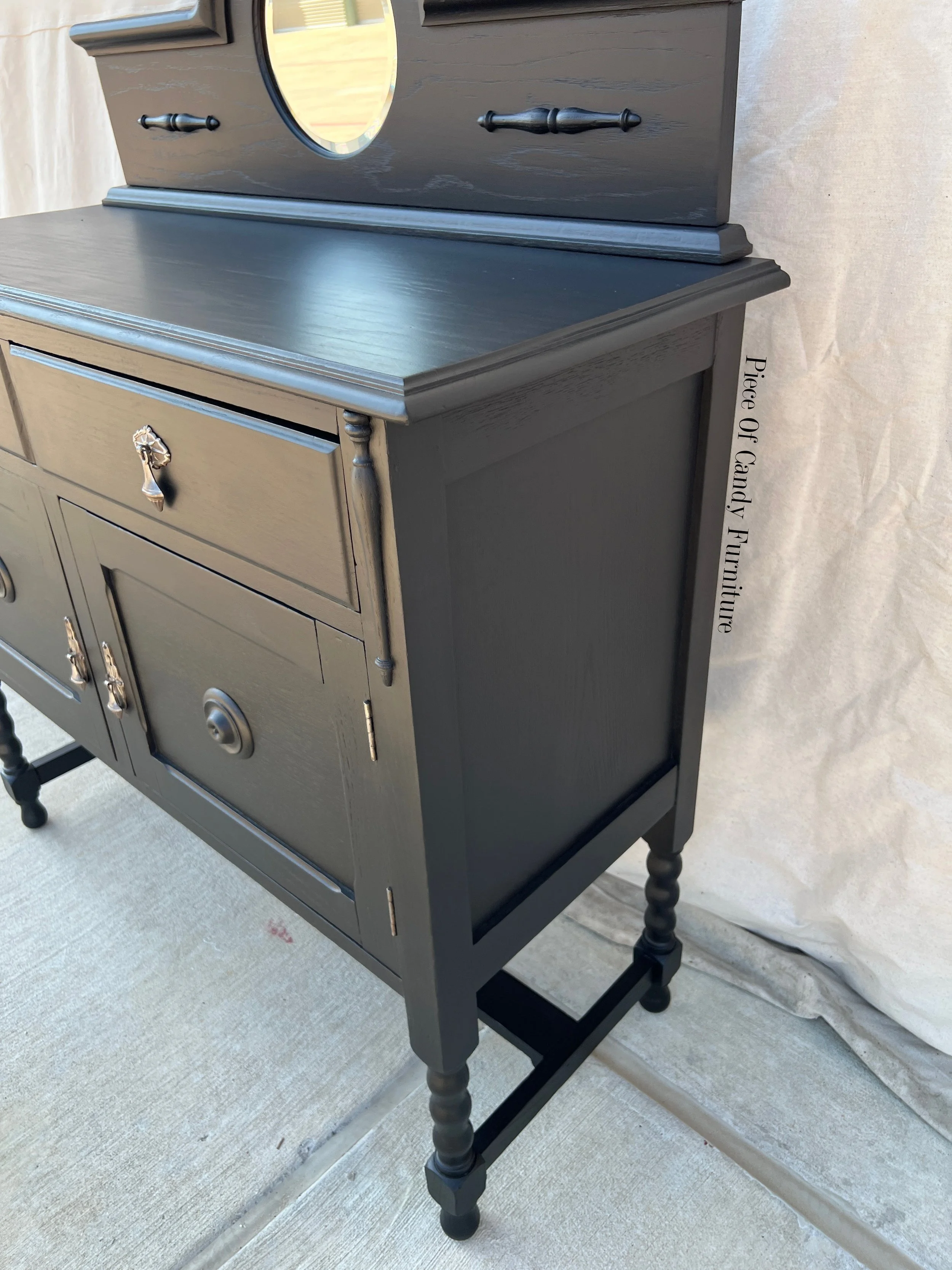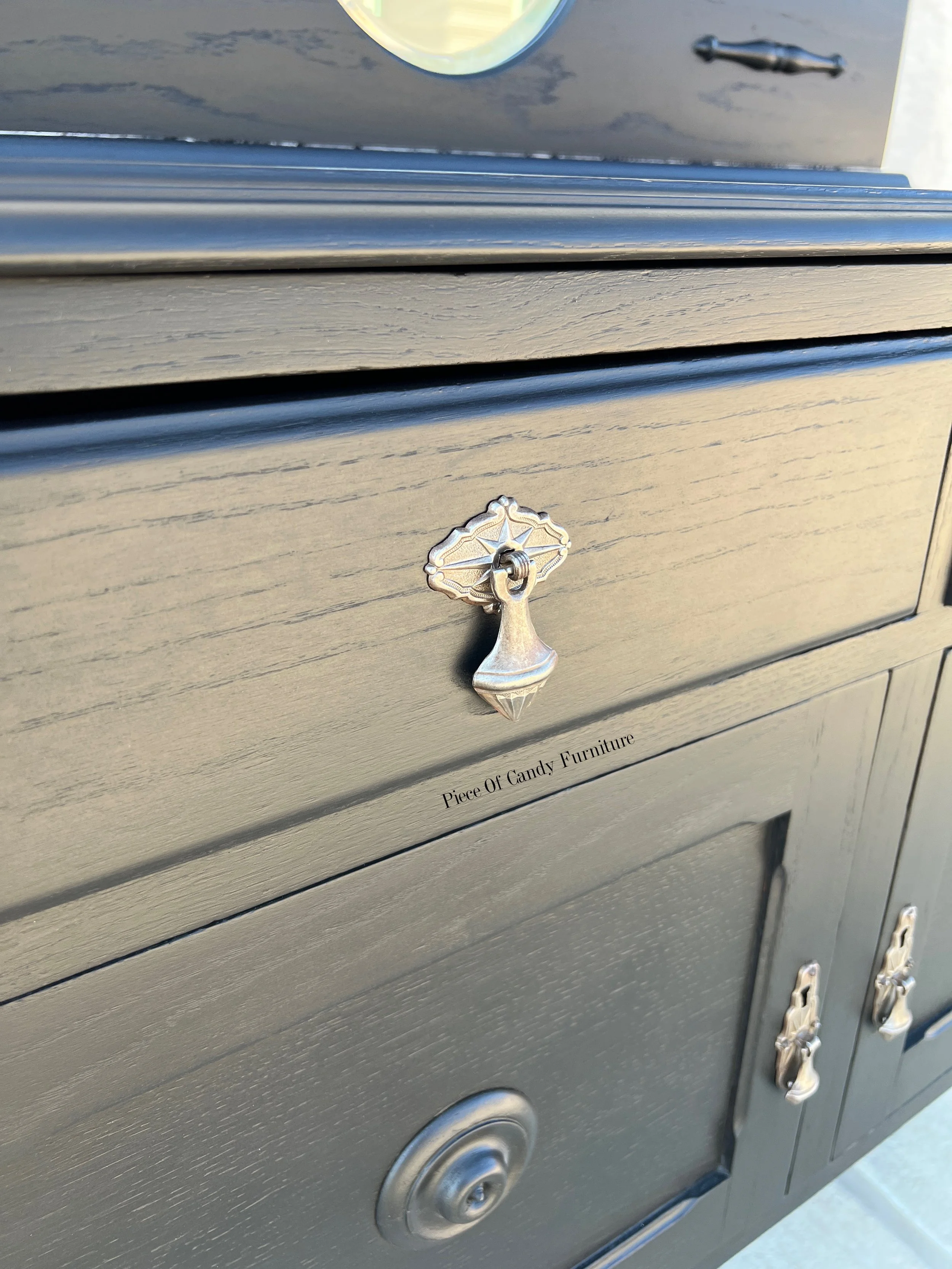 This was a custom order for Karen. She wanted her oak buffet painted in a satin black with hardware polished to a silver. Here below is the before.